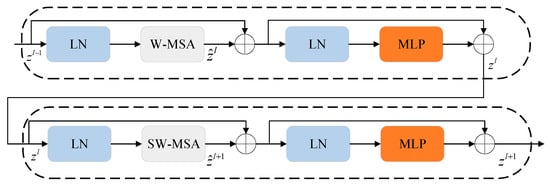 The outputs of the first block’s W-MSA and MLP modules are indicated by the letters and , respectively; the outputs of the second block’s SW-MSA and MLP modules are indicated by the letters and , respectively.