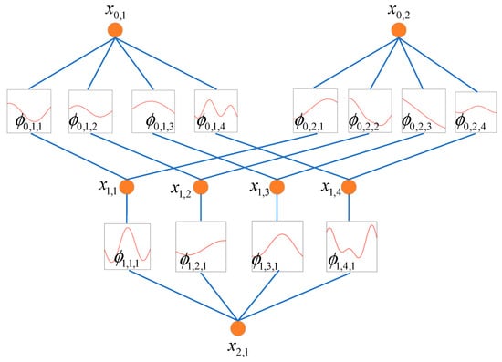 A multivariate function can be expressed as the superposition of continuous functions of a single variable with two parameters, according to the Kolmogorov–Arnold representation theorem. The neural network was viewed as a multivariate continuous function using the Kolmogorov–Arnold representation theorem [30,31]. These networks’ breadth and depth have always been 2 and 2n + 1, respectively, and they did not think about updating the network via backpropagation. Consequently, these models’ performance with high-dimensional data were subpar. Reference [29] created KANs with more adjustable widths and deeper layers based on MLP. It has been demonstrated that KANs can fit functions more accurately than MLP. For the interest of completeness, we give a quick overview of KANs here, but a more thorough explanation can be found in the work of [29].