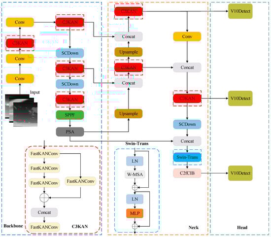 In this paper, an algorithm based on YOLOv10, called YOLO-IRS, is proposed for infrared ship targets, as shown in Figure 4. The YOLO-IRS model makes corresponding adjustments to the Backbone and neck parts of YOLOv10. First, the C2f module is replaced by the C3KAN module designed in this paper, which achieves better results in the feature extraction of weak infrared ship targets and enhances the feature fusion of multi-scale ship targets, successfully identifying infrared ship targets in the same image that vary in scale. Finally, in order to address the issue of missed target detection brought on by the intense occlusion of infrared ships close to coastal harbors, the Swin Transformer module is introduced before the C2fCIB module in the neck section of the model. With these improvements, the detection rate of YOLO-IRS on infrared ship targets has been further enhanced.