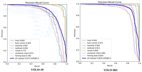 Figure 8 illustrates the comparison of PR curves for YOLOv10 and YOLO-IRS. Table 4 lists the average accuracies of YOLOv10 and YOLO-IRS for each type of target. Since sailboats and canoes are usually located near docks with complex backgrounds, the background interference is strong, increasing the detection difficulty. Therefore, the average recognition accuracy of these two classes of targets is lower compared to other classes. Compared to YOLOv10, the YOLO-IRS network proposed in this article boosts detection accuracy (P) by 1.3% for all classes, 0.5% for mAP50, and 1.7% for mAP50–95.