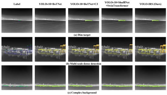 Table 3 presents a comparison of detection performance for various ship targets under several typical scenarios, including weak small ship targets, harsh weather conditions (sea fog), and complex backgrounds, between the proposed YOLO-IRS network and the original YOLOv10 algorithm. It can be observed that the YOLO-IRS network outperforms YOLOv10 in detection accuracy across different scenarios for various target types. Specifically, in the small target scenario, the mAP50 increased by 1.2%; in the sea fog scenario, mAP50 improved by 1%; and in the complex background scenario, mAP50 enhanced by 1.1%.