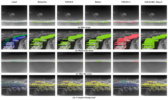 The same parameter configuration was utilized for the same infrared ship dataset, and none of the pre-trained weights were employed to guarantee that the experiments were fair in order to objectively evaluate the YOLO-IRS algorithm’s detection capacity and further confirm its improvement in detection accuracy. The results of the comparative trials between the traditional target detection algorithms, including RetinaNet, YOLOv8, RT-DETR, and YOLOv8-RT-DETR, are displayed in Table 7.