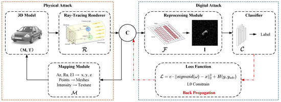 - We propose a new adversarial attack method for SAR ATRs based on the SAR imaging mechanism, which can generate adversarial examples that conform to SAR imaging characteristics. In the digital part, we use an optimization method to generate adversarial perturbations in the SAR geometric output data. In the physical part, we establish a digital–physical mapping module so that the perturbations ultimately act in physical space. Through the SAR imaging simulation process, the perturbations are converted into perturbations in the SAR images, making the attack stealthy.
