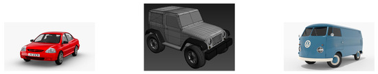 To the best of our knowledge, there is currently no physical dataset available for SAR simulation research (i.e., a dataset containing various 3D models and scenes). The commonly used SAR dataset for researchers, MSTAR, has 10 categories, and it is costly to construct a physical dataset with 10 categories from scratch. Considering the cost and richness of dataset categories, we chose to construct a new dataset by expanding the MSTAR dataset. The expansion method is as follows: we used three different 3D models of vehicles, namely, car, jeep, and van. The rendered images of these 3D models are shown in Figure 3, and the numbers of vertices and triangles for each model are shown in Table 2. Specifically, we used parameters similar to those of the MSTAR dataset at the same azimuth to generate SAR images of size 172 × 172 pixels at 1-degree intervals over 360 degrees. We utilized these 3D models to generate 2D SAR images and expanded the MSTAR dataset accordingly. The final dataset has 13 categories: 2S1, BMP2, BRDM_2, BTR60, D7, SLICY, T62, T72, ZIL131, ZSU_23_4, CAR, JEEP, and VAN. The number of images per category ranges from 428 to 720, as detailed in Table 3. Figure 4 displays SAR images of some targets, along with a comparison between our simulated SAR images and real SAR images in the MSTAR dataset.
