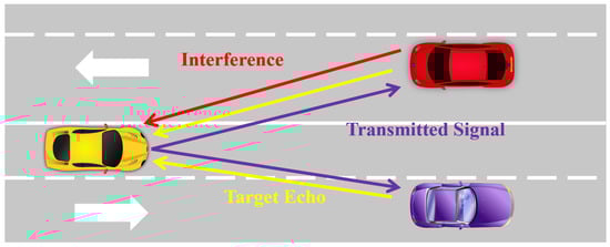 A radar is a robust sensor used in environmental sensing applications, such as autonomous driving and remote sensing, which enables target detection even under adverse weather conditions [1,2]. Frequency-modulated continuous-wave (FMCW) millimeter-wave (mmWave) radar systems offer a higher resolution and have lower manufacturing costs than conventional radars [3,4,5]. However, the mass deployment of FMCW radar systems in congested areas has led to escalating concerns regarding interference between the radar systems [6]. The limited spectrum poses serious challenges for reliable target detection in interference environments.