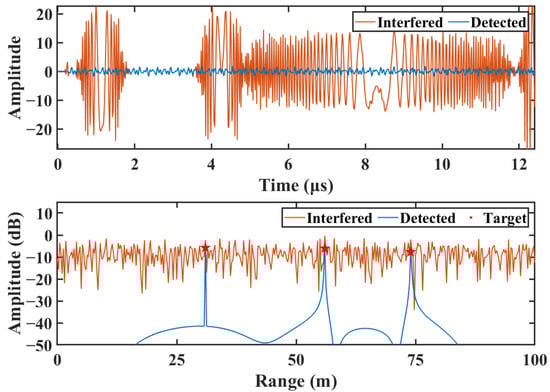 The time-domain waveforms of the interfered signal and the interference-free signal are shown in Figure 14, where the chirp-like interferences can be observed. There are two interference scenarios where the target signal is contaminated by one interference and two interferences, respectively. The strong interferences increase the noise floor in the range profiles and mask the weak targets, as illustrated in Figure 14c,d.