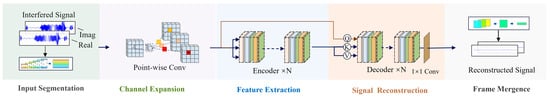 Recently, the effectiveness of DL-based interference suppression methods has been demonstrated. Recurrent neural networks (RNNs) have been used to deal with interference in the time domain [18,19]. In [20], the interference was mitigated by using a generative adversarial network (GAN). Another type of strategy was to convert the interfered signal into the time-frequency domain and perform two-dimensional processing. In [21], a complex-valued fully convolutional network (CV-FCN)-based architecture effectively suppressed the interference by exploiting prior features as a regularization term. Then, to further improve the interference mitigation performance, dilated convolution and designated contrast learning strategy were utilized for network construction and training, respectively [22]. By integrating the data-driven properties of DL and the advantages of compressed sensing (CS)-based interpretable optimization, an efficient feature-oriented unsupervised adaptive network called FUAS-Net was presented to suppress mutual interference [23]. The transformer is a powerful and promising technology in signal processing [24]. Transformer-based networks are especially adept at capturing repetitive patterns with extended dependencies, which are well suited for reconstructing the periodic target signals from the interfered signal. In preliminary work [25], the authors developed a novel end-to-end transformer-based interference mitigation structure named RIMformer, which performs well in interference cancellation and target signal reconstruction.