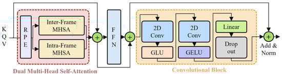 The structure of the RIMformer block is shown in Figure 4. The IF signal of the radar system is first transformed by a sliding window algorithm into a structured format consisting of the frame number, the frame length, and the channel. Each frame represents a localized portion of the signal and preserves temporal continuity through the overlap. This operation transforms the 1D signal into structured 2D data, allowing for the localized analysis of the adjacent frame. After the sliding window operation, the reassembled data block is then expanded along the channel dimension using a 1D convolution layer. This increases the feature richness by projecting each frame into a higher-dimensional feature space. These segmented signals are analyzed along the frame number and length, with attention mechanisms computed within each frame (intra-frame) and across the frames (inter-frame). Intra-frame attention captures short-term signal correlations, whereas inter-frame attention reflects long-term dependencies across the sequence. The normalized attention results are combined with the original input via residual connections, forming the final output of the attention layer. The next layer is a fully connected feedforward network (FFN), including a hidden layer and an activation function for non-linear transformation of the features at each position. The output from the FFN is subjected to layer normalization and residual connections to ensure data stability. The introduction of the convolutional block enables the use of CNNs for local feature extraction. Each block comprises two convolutional layers, a linear layer, and several activation functions. The gated linear unit (GLU) [37] is positioned between the two convolutional layers. The GLU dynamically adjusts its activation level and output in response to the input signal’s strength and characteristics, providing enhanced adaptability and flexibility for processing complex input data. The commonly used mean squared error (MSE) loss function is limited to capturing discrepancies among predicted signals solely in the time domain. Therefore, in the RIMformer, a hybrid time-frequency loss function is designed to encompass the errors of the reconstructed signal in both the temporal and frequency domains. The hybrid loss function is calculated as follows: