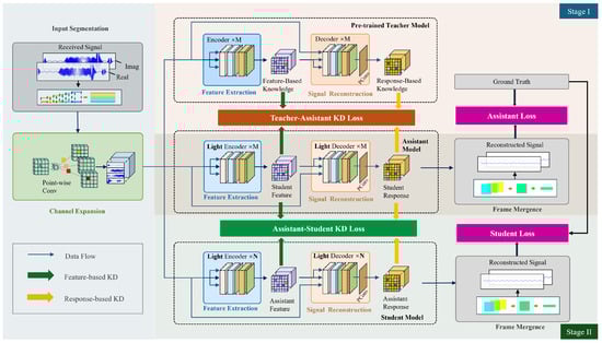 It has been observed that when the discrepancy between the teacher and student networks is too high, there is a decline in the efficiency of KD. To address this challenge, we propose a multi-step KD approach involving an intermediate-sized network (an assistant model) to bridge the gap between the student and teacher networks. The overall process is depicted in Figure 5. By introducing an intermediate assistant teacher model, we create a smoother knowledge transfer process. The intermediate assistant teacher model incorporates lightweight design improvements but retains a structure closer to the original teacher. It acts as a “bridge” by effectively distilling the critical features and representations from the teacher model in a simplified form. The student model can then learn from the assistant model in the second stage, with improved alignment due to the significantly reduced gap in model capacity and complexity. The two-stage approach strikes a balance between computational efficiency and performance. Although the addition of an intermediate model introduces an additional training step, this step is essential to help the lightweight student model achieve competitive performance in interference mitigation without sacrificing the benefits of the proposed lightweight designs.