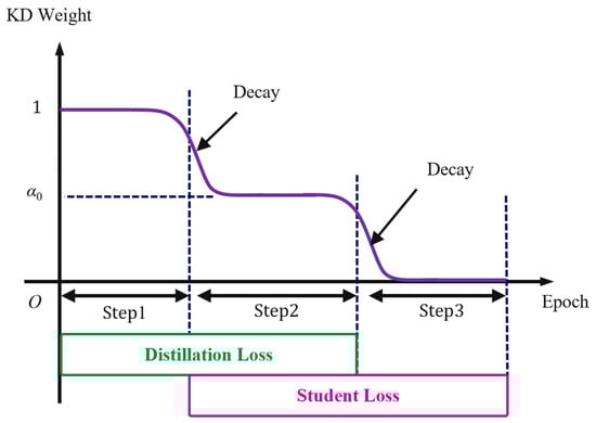 Furthermore, KD is optimized through dynamic loss balancing. As shown in Figure 6, the proposed training strategy involves adjusting the weight parameter in the network loss function throughout the training process. Initially, the integration of distilled knowledge from the teacher network is accentuated with a large weight, which fosters a swift convergence of the student network towards an optimal solution. Subsequently, a medium weight strikes a balance between the influences of KD and label prediction losses. The student network’s comprehension is refined with mitigated excessive reliance on pre-existing knowledge. Lastly, the employment of a smaller weight in later stages alleviates the risk of overfitting the teacher’s knowledge and facilitates generalization to unseen data. This dynamic methodology provides a nuanced and efficient approach to distill knowledge while ensuring the adaptability and resilience of the student network.