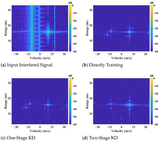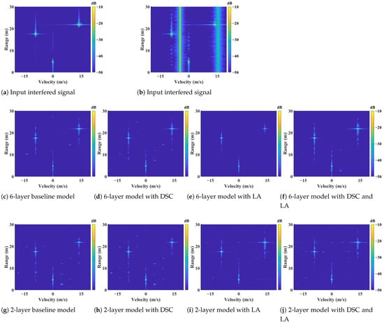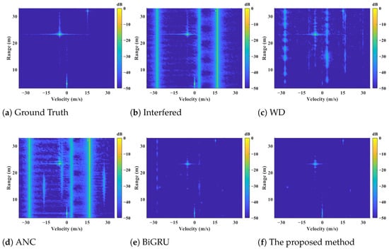 To visualize the differences in interference suppression performance between the different models, the results are compared by using a set of range-Doppler (RD) maps of the output results, as shown in Figure 7.