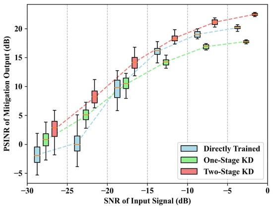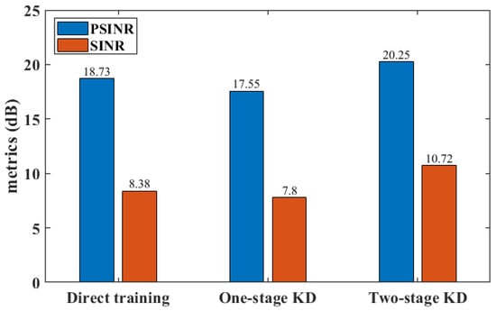 Figure 8 shows the results for the models with different training methods, including the PSINR and SINR. The performance of the model using one-stage KD is inferior to that of the directly trained model. This is because the significant differences between the teacher and student models hinder the effective transfer of knowledge from the former to the latter during the training phase. Two-stage distillation results in a smaller student model with an improvement in both the PSINR and SINR compared to direct training and one-stage KD.