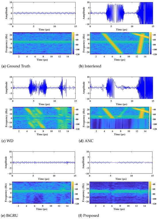 Comparison of time-domain waveforms and time-frequency plots after interference suppression.
