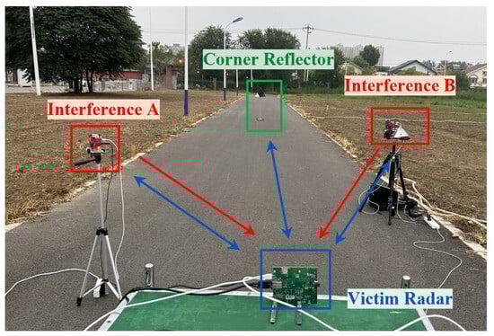 Measured experiments are conducted to validate the effectiveness of the proposed method in real-world scenarios. The experimental setup is based on a closed road, as illustrated in Figure 13. One TI AWR1243 radar is selected as the victim radar, while the TI AWR1243 and TI AWR1642 radars are selected as the interfering radars, which are placed at about 1 m and 2 m away from the victim radar, respectively. The former is used for target detection, while the latter two radars are used for transmitting interference signals. A corner reflector serves as a target at a distance of approximately 10 m from the victim radar. The victim radar also receives the signals reflected from the two interfering radar boards, therefore the two interfering radar boards behave as two stationary targets. The specific radar parameter settings are presented in Table 4. For the victim radar, the initial frequency is set at 77.0 GHz. Each frame comprises 128 chirps, and each chirp contains 1024 sampling points.