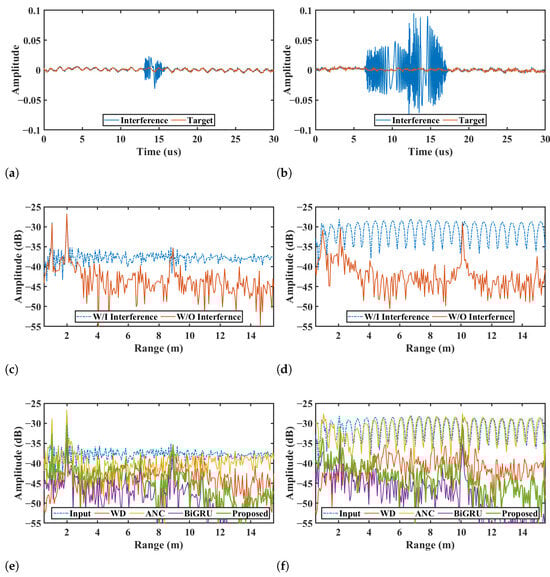 The range profiles after applying different interference suppression methods are shown in Figure 14e,f. The ANC method uses the negative frequency component of the IF signal as the reference channel and utilizes a least mean squares algorithm to solve for the optimum filter solution. Therefore, the ANC method preserves the amplitude of the target signal. The amplitude of the target signal restored by the ANC method is higher than the signals of the WD method, the BiGRU-based method, and the proposed method. However, there is residual interference in the range profiles of the ANC method in Figure 14e,f. In scenario 2 with two interferences, the ANC method slightly reduces interferences. The WD method and the BiGRU-based method suppress the interference but cause power loss of the target signal. In addition, the performance of the WD method degrade when the percentage of samples contaminated by the interference increases, as illustrated in Figure 14f. In contrast, the proposed distilled lightweight RIMformer effectively mitigates interferences and recovers the target signal in both scenarios 1 and 2.