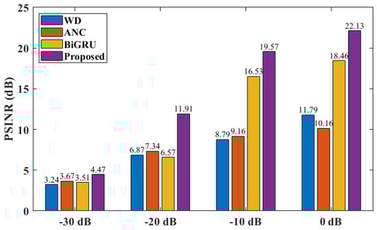 Performance Across Different Input SNRs: As shown in Figure 15, the effects of the noise level in the interfered signal on the interference mitigation performance are investigated. The results show that the network maintains high performance even though the input SNR varies. This ability is crucial for practical applications where the environmental conditions can cause significant fluctuations in signal quality.