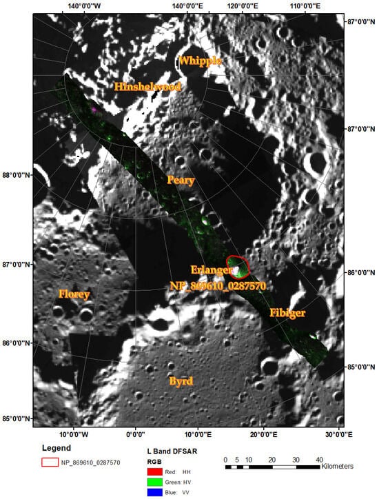 As illustrated in Figure 1, the Erlanger Crater is situated within the region of permanent shadow in the lunar north pole, designated with the PSR id NP_869610_0287570. The image strip presented in Figure 1 depicts a DFSAR L-band composite image that nearly encompasses the entirety of the Erlanger Crater.