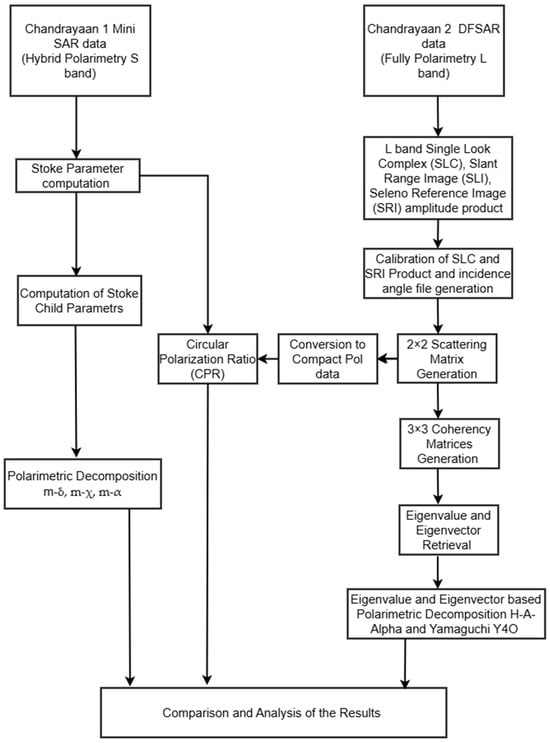 In addition to the Apollo mission, numerous other missions, including SELENE (Kaguya) from the Japan Aerospace Exploration Agency, and the Chang’e series from the China National Space Administration, as well as the Lunar Reconnaissance Orbiter from the United States, were initiated, resulting in the acquisition of substantial information regarding the lunar surface environment and atmosphere, and contributing significantly to the understanding of the historical evolution of the Moon. A study published in Nature Geoscience reveals a critical reaction that occurred deep within the Moon approximately 3.5 billion years ago that affected the magma composition and distribution across its surface []. Among such missions are India’s Chandrayaan-1 and Chandrayaan-2, which were launched on 22 October 2008 and 22 July 2019, respectively, and which investigated the lunar surface environment, yielding crucial insights regarding the Moon [,]. Mini-SAR and DFSAR represent the synthetic aperture radar sensors integrated into these two missions, which facilitate the physical characterization of the lunar surface environment [,,,] as well as the identification of entrapped water ice particles within the lunar regolith. Synthetic aperture radar (SAR) data are predominantly influenced by a range of system parameters, which encompass the wavelength, the angle of incidence, and polarization, as well as different target parameters that involve the electrical and structural characteristics of the object under observation []. The majority of the lunar pole comes under the permanently shadowed regions that never receive sunlight. By analyzing these PSRs with synthetic aperture radar data, one can gain valuable insights about the region and aid in the physical characterization of the lunar surface environment, which is important for researching water ice []. Recent studies have emphasized how the roughness properties of lunar craters can indicate crater degradation and provide insight into their ages []. Furthermore, research has shown that elevated circular polarization ratios (CPRs) combined with significant volume scattering are indicative of ice deposits in these regions [].