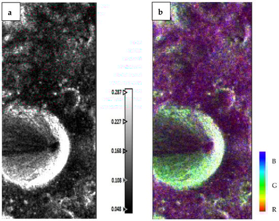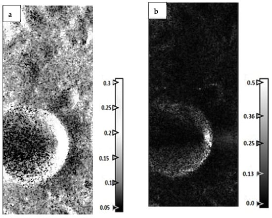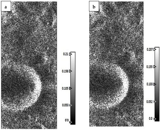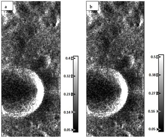 Figure 9a,b depict the Erlanger Crater’s Entropy (H) and Alpha (α) images as viewed by DFSAR data, which were produced using H-A-Alpha decomposition algorithms. The Anisotropy (A) and the RGB composite of the H-A-Alpha decomposition image are displayed in Figure 10a,b, respectively. The Entropy (H), Alpha, and Anisotropy (A) are the polarization parameters that were used to derive the H-A-Alpha model. This H-A-Alpha RGB composite image helps to characterize the different types of scattering mechanisms occurring on the surface of the moon.