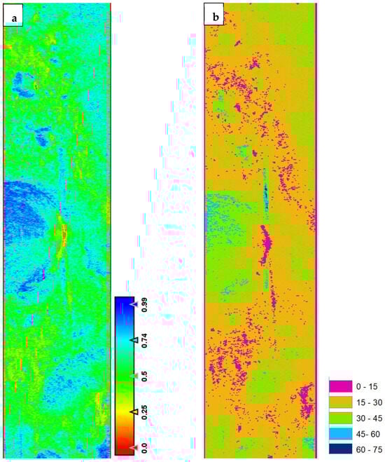 Eigenvalue and Eigenvector–based decomposition parameters image: (a) Entropy (H); and (b) angle alpha image.