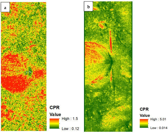 where SC is received power in the same sense and OC is the transmitted power in the opposite sense. It is derived using Stokes parameters S1 and S4, where S1 represents the difference between the horizontal and vertical linear polarization components and S4 represents the difference between right-handed and left-handed circular polarization components as mentioned in Equation (16). A CPR value greater than one denotes a rough surface, while a value less than one suggests surface scattering.