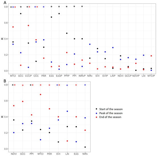 Correlation coefficient (R) for the linear model between gross primary production-derived (A) or canopy chlorophyll content-derived (B) phenological parameters and the phenological parameters derived from different reflectance-based parameters. All observations, regardless of site, treatment, and year, were analyzed together (n = 72). The stars of a particular color indicate a significant correlation at alpha = 0.05. CCC—Canopy Chlorophyll Content, EVI—Enhanced Vegetation Index, ExG—Excess Green, GCC—Green Chromatic Coordinates, LAI—Leaf Area Index, MTCI—MERRIS Terrestrial Chlorophyll Index, NDVI—Normalized Difference Vegetation Index, NIRv—Near-Infrared Reflectance of Vegetation, PAR—Photosynthetically Active Radiation, PPI—Plant Phenology Index, CCCP—CCC*PAR, EVIP—EVI*PAR, ExGP—ExG*PAR, GCCP—GCC*PAR, LAIP—LAI*PAR, MTCIP—MTCI*PAR, NDVIP—NDVI*PAR, NIRvP—NIRv*PAR, PPIP—PPI*PAR.
