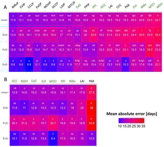 The mean absolute error of chosen remote sensing metrics-derived gross primary production-based (A) and canopy chlorophyll content-based (B) start of the season (SoS), peak of the season (PoS), end of the season (EoS), and the general performance calculated as the mean of SoS, PoS, and EoS (mean). Different letters within the cells of the same parameter (SoS, PoS, Eos, or mean) denote significantly different performances at alpha = 0.05, as found by the Conover test. Green names of metrics denote the simple vegetation indices. CCC—Canopy Chlorophyll Content, EVI—Enhanced Vegetation Index, ExG—Excess Green, GCC—Green Chromatic Coordinates, LAI—Leaf Area Index, MTCI—MERRIS Terrestrial Chlorophyll Index, NDVI—Normalized Difference Vegetation Index, NIRv—Near-Infrared Reflectance of Vegetation, PAR—Photosynthetically Active Radiation, PPI—Plant Phenology Index, CCCP—CCC*PAR, EVIP—EVI*PAR, ExGP—ExG*PAR, GCCP—GCC*PAR, LAIP—LAI*PAR, MTCIP—MTCI*PAR, NDVIP—NDVI*PAR, NIRvP—NIRv*PAR, PPIP—PPI*PAR.