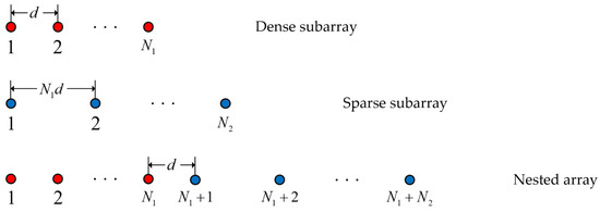 We employ the two-level nested array [11] as the sparse array configuration. When compared with other sparse arrays, nested arrays present several notable advantages. Their configuration design is simple and easy to implement [15]. Additionally, the difference co-array generated by nested array exhibits uniformity and continuity, which is exceptionally conducive to subsequent reconstruction processes [39]. A nested array is composed of two sub-arrays arranged in front and back, namely dense subarray and sparse subarray, as shown in Figure 2. The number of dense array elements is and the distance between elements is . The number of sparse array elements is and the distance between elements is . The total number of array elements is . The explicit expressions of nested array are as follows [15]:
