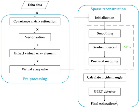 Figure 4 illustrates the complete flowchart of our proposed algorithm, which is divided into two parts: pre-processing and sparse reconstruction. The pre-processing step extracts virtual array element information from the echo signals, which is followed by sparse reconstruction using the accelerated ANM algorithm. Finally, the GLRT detector is applied to obtain the final reconstruction results.