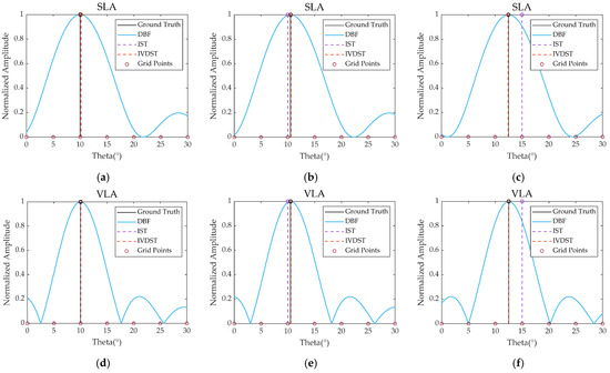 where represents the number of Monte Carlo experiments, represents the estimated value of the target angle in the -th experiment, and represents the true value of the target. As shown in Figure 6, the reconstruction performance using VLA is significantly better than SLA for both algorithms. Moreover, the VLA-based algorithm exhibits better noise resistance, and its reconstruction performance is basically not affected by noise. Under on-grid conditions, the reconstruction performance of the IST and IVDST algorithms are comparable. However, in off-grid scenarios, the performance of the IST algorithm is limited by errors induced by grid points, whereas the IVDST algorithm exhibits superior performance.