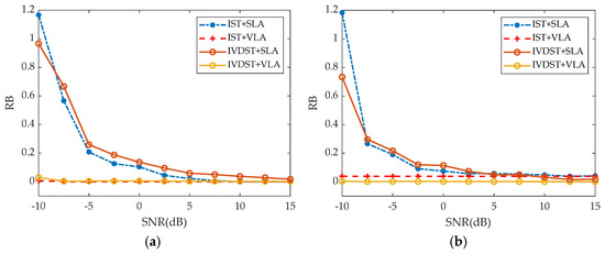 Furthermore, for the IVDST algorithm, the reconstruction results using SLA are inferior to those using VLA. Hence, we conducted detailed comparative experiments on the reconstruction performance of IST and IVDST algorithms through Monte Carlo simulations under two conditions, on-grid and 0.5° off-grid. We introduced relative bias (RB) as an evaluation metric to quantitatively analyze the reconstruction accuracy: