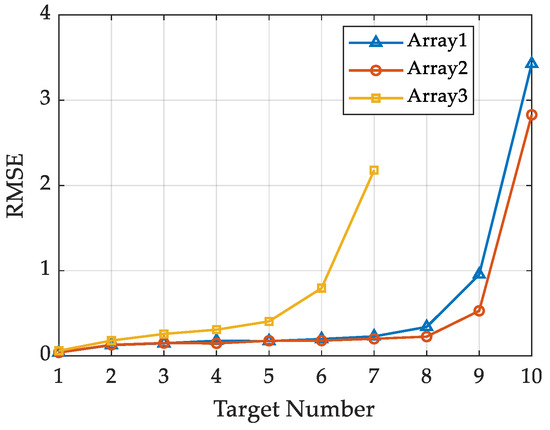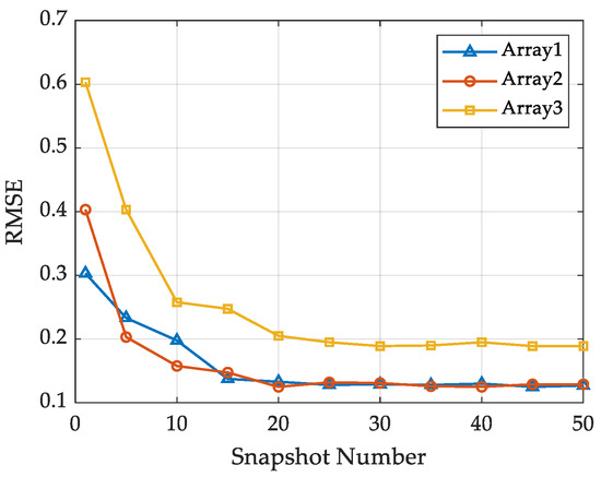Since information from virtual array elements is extracted through the covariance matrix, the estimation of the covariance matrix is crucial to our proposed algorithm. We selected Array 1, Array 2, and Array 3, which possess super-resolution capabilities in Table 3, to evaluate the impact of the number of snapshots on reconstruction accuracy. A single point target was randomly selected within the range of −30° to 30°, and the number of snapshots was set to 1, 5, 10, 15, 20, 25, 30, 35, 40, 45, and 50, while other parameters remained consistent with those in the previous simulation experiments. The reconstruction accuracy obtained from 100 Monte Carlo simulations is presented in Figure 8.