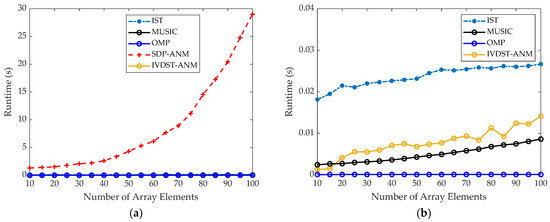 Comparison of processing time under different number of array elements: (a) IST, MUSIC, OMP, SDP-ANM and IVDST-ANM; (b) IST, MUSIC, OMP, and IVDST-ANM.