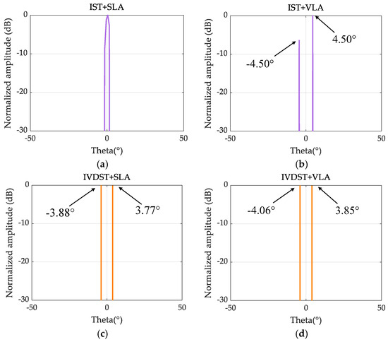 DOA estimation results of IST and IVDST: (a) IST+SLA; (b) IST+VLA; (c) IVDST+SLA; (d) IVDST+VLA.