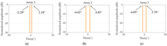 DOA estimation results of different arrays: (a) Array 1: ; (b) Array 2: ; (c) Array 3: .