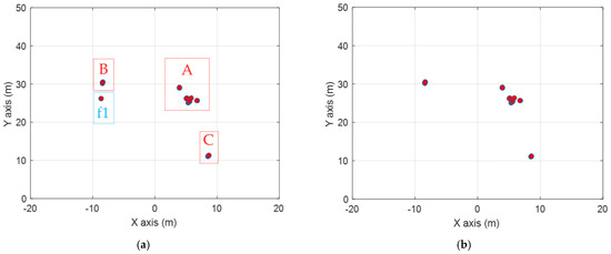 As shown in Figure 15, our proposed algorithm achieved satisfactory reconstruction results for the first dataset. The center coordinates of vehicle A were approximately (5.12 m, 26.35 m), located in front of and to the right of the radar. The coordinates of electric bicycle B were (−8.41 m, 30.35 m), situated in front of and to the left of the radar. The coordinates of streetlight C were (8.58 m, 11.18 m), located in front of and to the right of the radar. Through analysis of the vehicle in region A, we determined the length of the vehicle to be 4.13 m and its width to be 1.62 m, which aligns with the actual values. In the reconstructed image Figure 15a, points labeled f1 represent false targets, likely caused by multipath propagation and clutter from other weak targets. The GLRT detector can effectively eliminate these false targets in region f1 while preserving the real targets, as shown in Figure 15b.