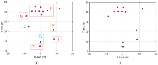 As shown in Figure 17, the coordinates of two corner reflectors were (−0.37 m, 4.93 m) and (0.14 m, 4.94 m), located 4.94 m directly in front of the radar. The roadblock F was positioned 40.69 m ahead of the radar, with a lateral length of approximately 6.62 m. Streetlight G was located at (−8.79 m, 35.52 m) in the front-left direction of the radar. Traffic light H was positioned at (8.17 m, 21.61 m) in the front-right direction of the radar. Streetlight I was located at (8.60 m, 12.29 m) to the front-right of the radar.