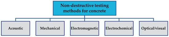 Non-destructive testing can be categorized into five primary groups [11]: acoustic, mechanical, electromagnetic, electrochemical, and optical/visual methods (Figure 1).