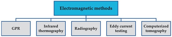 Electromagnetic methods, shown in Figure 2, represent the second most popular category of non-destructive testing for concrete elements, including a ground-penetrating radar (GPR) which was chosen for further consideration in this research. They work by emitting electromagnetic waves into the material, which are then reflected back, providing information on the internal structure. In addition to GPR [13,19], the following techniques are also used: infrared thermography [13,20], radiography [13,15], eddy current testing [15], and computerized tomography [16].