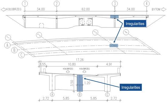 This research presents in detail an example of irregularities found in the WS-5 viaduct of the right carriageway on the S11 Polish expressway (Figure 5). The structure is a three-span continuous beam made of C50/60 class prestressed concrete. The theoretical spans are 34.0 m + 62.0 m + 34.0 m = 130.0 m. The skew angle of the structure is variable and ranges from 32.3° to 39.4°. It was designed for class A road load (K + 0.3K) according to the Polish Standards (PN). The total width of the structure of the right carriageway is 15.30 m. There is a one-way road running through the structure, 12.65 m wide (between the curbs). The superstructure of the viaduct consists of three beams with a rectangular cross-section with an axial spacing of 4.70 m, connected by a reinforced concrete deck slab with a thickness of at least 0.25 m. The beams are 1.20 m wide and have a variable height ranging from 1.80 m to 3.50 m. The left cantilever has an overhang of 1.77 m, while the right one has an overhang of 2.81 m. Both cantilevers have a variable thickness decreasing from 0.45 m at the attachment to the girder to 0.24 m at the ends. In addition to the support crossbeams, a span crossbeam was also designed-one in the extreme spans and one in the central span. The spans are supported by pot bearings, three on each support. The supports consist of two abutments and reinforced concrete piers. The piers were designed as column structures and each intermediate support consists of three columns with a rectangular cross-section. The supports were designed as direct foundations on reinforced ground.