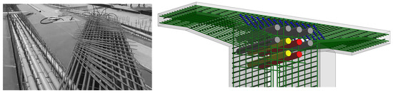 Analysis of the documentation related to the arrangement of reinforcement, the location of cable ducts in the support sections, and the intersection of the reinforcement from the crossbeams indicate the risk of possible damage to cable sheaths and air vents during concreting. High girders up to 3.50 m in the support cross-section with 10 cables laid in the upper zone together with a high density of reinforcement of the girders and support crossbeams create difficulties during concrete casting (Figure 8). Inserting the rubber pipe while casting the concrete mixture and compacting it with immersion vibrators were the main causes of damage to the prestressing cable sheaths and failure due to their lack of tightness. It should be noted that at this stage it was not possible to clearly determine which of the above factors was the cause of the failure. Nevertheless, it should be clearly stated that the failure was caused by human error during the concreting process of the superstructure. The built-in cable sheaths 8 and 10 have an external diameter of 117 mm and 127 mm, respectively. With a cable axial spacing of 250 mm, the free space for introducing the concrete mixture was 133 mm (second row of cable routes) and 123 mm (third row of cable routes). Photographic documentation confirms the existence of connections between the cable sheaths within the support cross-section, which additionally posed a risk of loss of tightness at the site of the failure.