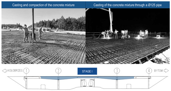 The concrete mixture was fed from support 1 toward support 4. The layers of the mixture did not exceed the thickness of 50 cm. In order to achieve proper bonding between subsequent layers, the method used required laying the next layer before the freshly laid layer began to set. The concrete mixture was compacted using immersion vibrators. Correct placement and compaction of the mixture without segregation required the pump hose to be inserted between the cable sheaths in the support zone (Figure 9). At this stage of the work, there was a risk of damaging the cable ducts and vents. A local, unintended horizontal joint formed during the laying of the last layer of the mixture (at the height of the second row of cable ducts) which facilitated the transmission of the grout in the support zone.