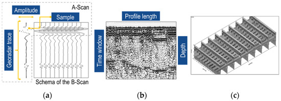 Classification of Ground Penetrating Radar (GPR) Data: (a) A-scan and schema of the B-scan; (b) image of the B-scan; (c) C-scan.