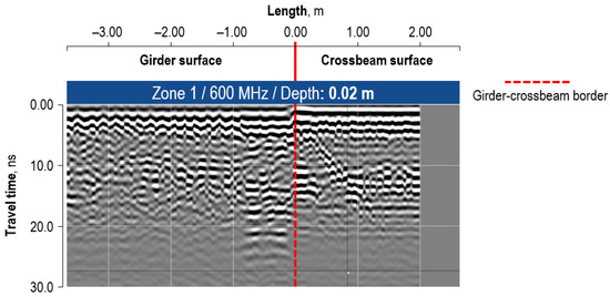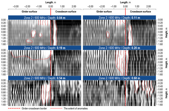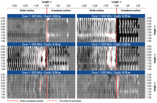In side zone 1 (Figure 12), anomalies related to local changes in the concrete structure were found at various ordinates and depths. The figure aligns to the side surface of the girder and the crossbeam. Due to the size of the GPR device, the 0.0 m ordinate is relative and is located 0.20 m below the bottom surface of the slab. In the cover layer, small-volume voids of up to 0.40 m in height were revealed. Further investigation indicated anomalies of greater extent, including 0.50 m width at the depth of 0.15 m, and 1.00 m width at the depth of 0.20 m. Their vertical extent covered almost the entire height of the girder, up to 1.20 m. Their size decreased in the deeper regions of the GPR image.