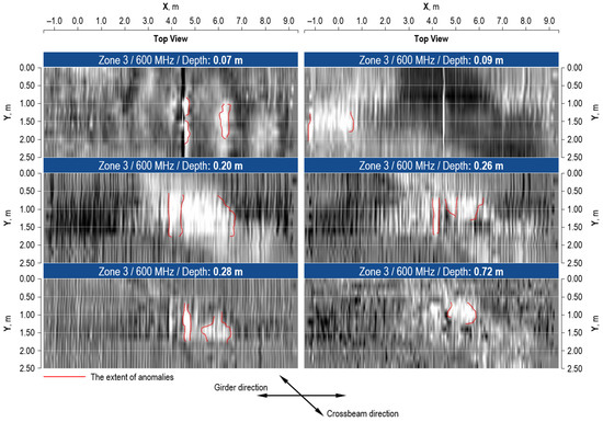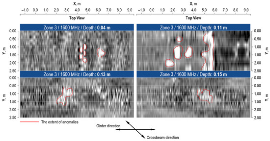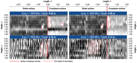 The use of a 1600 MHz antenna allowed the anomalies in the shallow layers of the surveyed zones to be recognized (Figure 16, Figure 17 and Figure 18). Due to the geometrical complexity of the structure and the reinforcement ratio in the analyzed zones, the reliable depth reached by the radar is limited to a depth of 0.15 m. The local anomalies of 0.50 m width were found in the cover layer within the depth of 0.10 below the surveyed surface.
