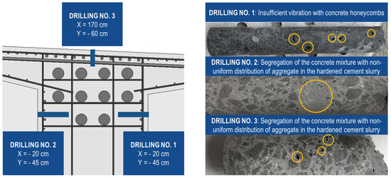 Based on GPR identification tests, the occurrence of anomalies related to local irregularities in the concrete structure in girder B was confirmed. In order to fully assess these irregularities, three control drillings were performed using a drill bit with a diameter of 50 mm and a depth of up to 250 mm for horizontal points and up to 150 mm for vertical points. The locations of the boreholes are shown in Figure 19. Based on the drillings, it was determined that the anomalies identified using the GPR method are associated with local imperfections in the concrete structure and rule out the presence of concrete voids. Examination of the collected samples confirmed the occurrence of isolated internal concrete honeycombs up to 5 mm attributed to insufficient vibration of the concrete and non-uniform distribution of aggregate in the hardened cement slurry due to segregation of the mixture during concreting. The identified concrete structural anomalies are a common technological phenomenon and do not affect the load-bearing capacity and durability of the structure.