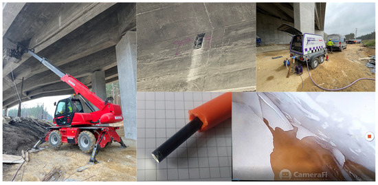 Taking into account the results of tests identifying the type and scope of irregularities in the concrete structure at the locations where cable sheath leaks occurred, it was decided to implement a repair program involving supplementary injection. In order to fully inject cables No. 8 and 10, it was necessary to gain access to the cable sheath zones through hydro-cutting at selected places. Then, from the inspection windows, the patency of the sheaths was checked using compressed air and an endoscopic camera (Figure 20). After confirming the extent of the injection discontinuity of the cables and the reach of the injection mortar, additional injection was initiated using the inspection window. The entire work required air-tight sealing of cable ducts with injection power supply and venting installations, as well as reconstruction of the concrete of the inspection windows.
