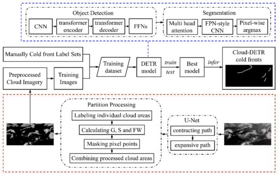 Among these, the preprocessing method of cloud images consists of two key steps. The initial cloud areas in infrared cloud images are firstly identified, and a partition processing method is then employed to obtain preprocessed cloud images. The partition processing method involves four main steps: labeling individual cloud areas; calculating G (the gray value), S (the seasonal benchmark) and FW (the filter weight); masking pixel points using FW; and combining processed cloud areas at the same time, as detailed in Section 2.2.1. Additionally, the processing with the DETR model involves two steps. Firstly, the object detection step locates prediction boxes indicating potential cold fronts using a CNN backbone, an encoder–decoder transformer, and prediction feed-forward networks (FFNs). Then, the segmentation step achieves cold front segmentation by adding a mask head on top of the decoder outputs.