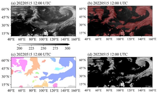 Preprocessing of infrared satellite cloud image at 12:00 UTC on 15 May 2022: (a) FY-2G infrared brightness temperature (shaded, K); (b) the cloud area initially segmented by the U-Net model in the first step (shaded in red); (c) labeling results of individual cloud areas in the second step; (d) the partition processing result.