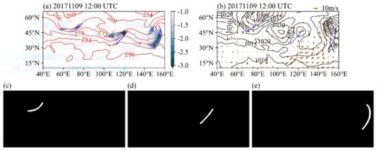 Generating of cold front labels at 12:00 UTC on 9 November 2017: (a) manually generated cold fronts (blue lines), cold advection at 850 hPa (shaded, 10−4 K/s) and temperature at 850 hPa (contours, K); (b) manually generated cold fronts (blue lines), sea-level pressure (contours, hPa) and surface 10 m wind (arrows, m/s); (c–e) thickened cold front labels.